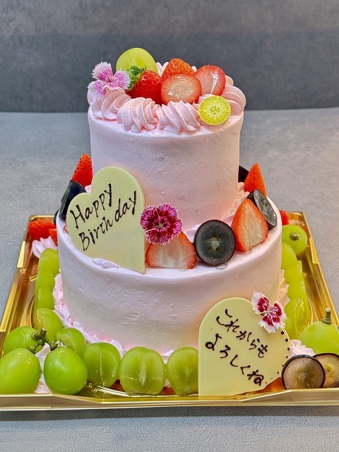 ケーキの形:2段重ね クリームの色:ピンク ・フルーツ盛り [掲載サイズは上段3号 下段5号 人数の目安:8名程度]
